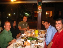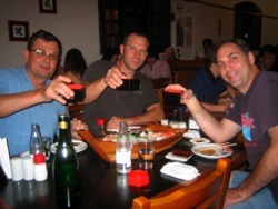 One very nice thing about the hotel we’re in is that it’s located in the heart of the city. Thus, we have many choices where to go eat dinner at night, as opposed to Porto Alegre. The top shot is of Adam, myself, and Jim eating at a sushi bar. They really like pouring the sake in those boxes. Makes for awkward drinking. The other photos are from some of the other restaurants with some of the other instructors. Also, some of the NSCAD people have come up from Porto Alegre to help us, and it’s been great to see them here.
